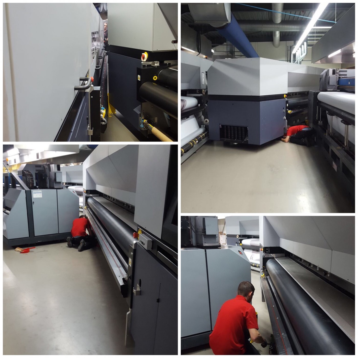 This 8,74 meter long , 2,10 meter wide, 2,28 high and 7500 kg weighing printer had to be carefully moved in a live and narrow printing environment to get to its place of use.